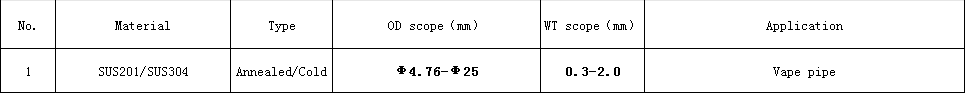 Specifiation of stainless steel pipe for vape